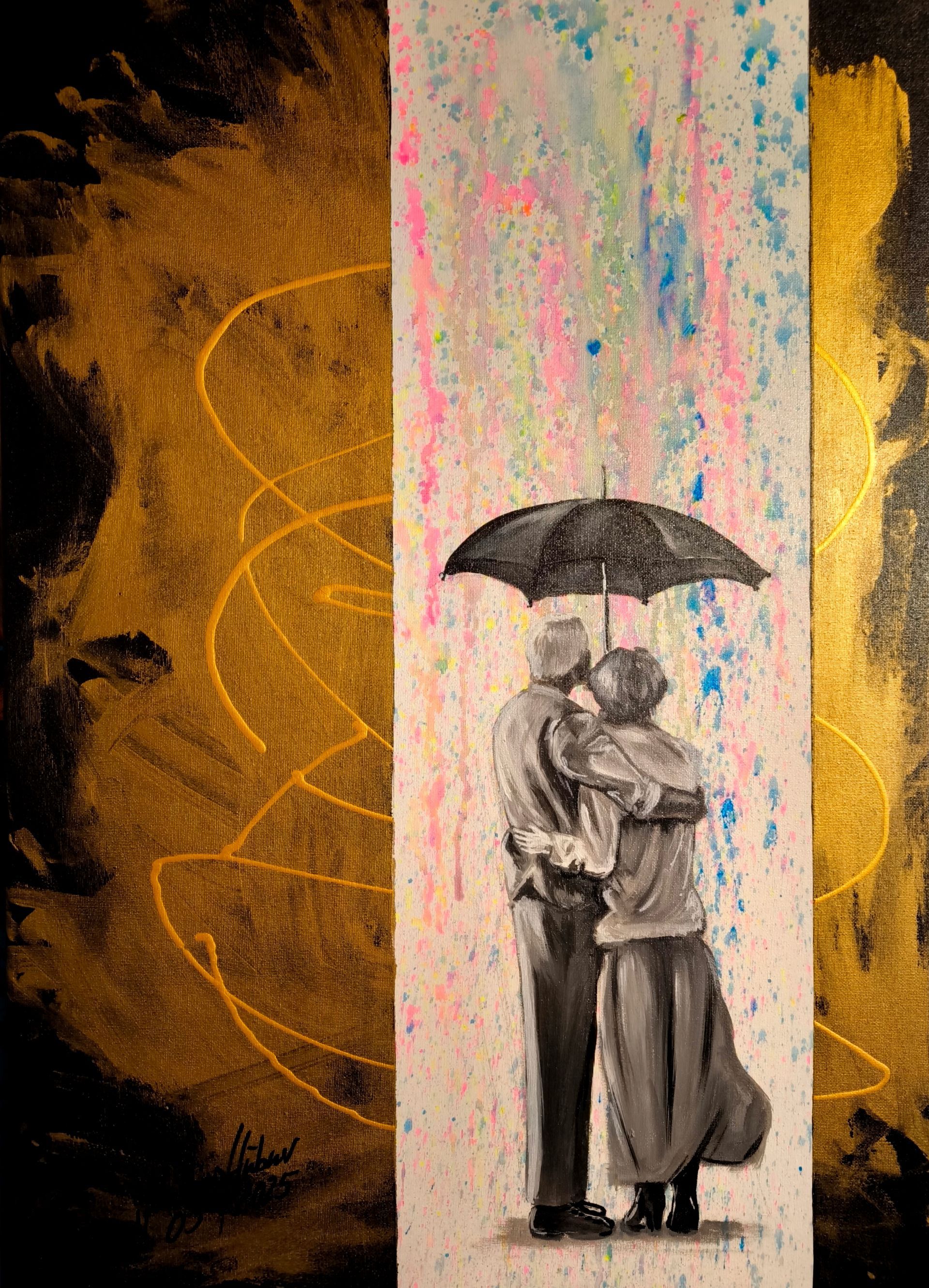 "Leben" kam in einer Ausstellung so gut an, dass es schnell verkauft war und es gab eine Besucherin, die unbedingt ein Ähnliches haben wollte. Also ließ ich mich gegen meine Überzeugung darauf ein, ein Ähnliches zu malen. Es hat ziemlich lange gedauert. Eine erste Idee landete im Müll. Bei diesem hier hatte ich zwar ein gutes Gefühl, brauchte aber sehr lange, bis ich wusste, was ich mit den schwarzen Flächen rechts und links anfangen sollte. Ich klebte das Hauptmotiv ab und verwischte Goldfarbe über die gesamte Leinwand, die ich darauf auch noch mit zähflüssigem "Gold" direkt aus der Spritzflasche bedeckte. Malerkrepp ab und fertig war das Bild.