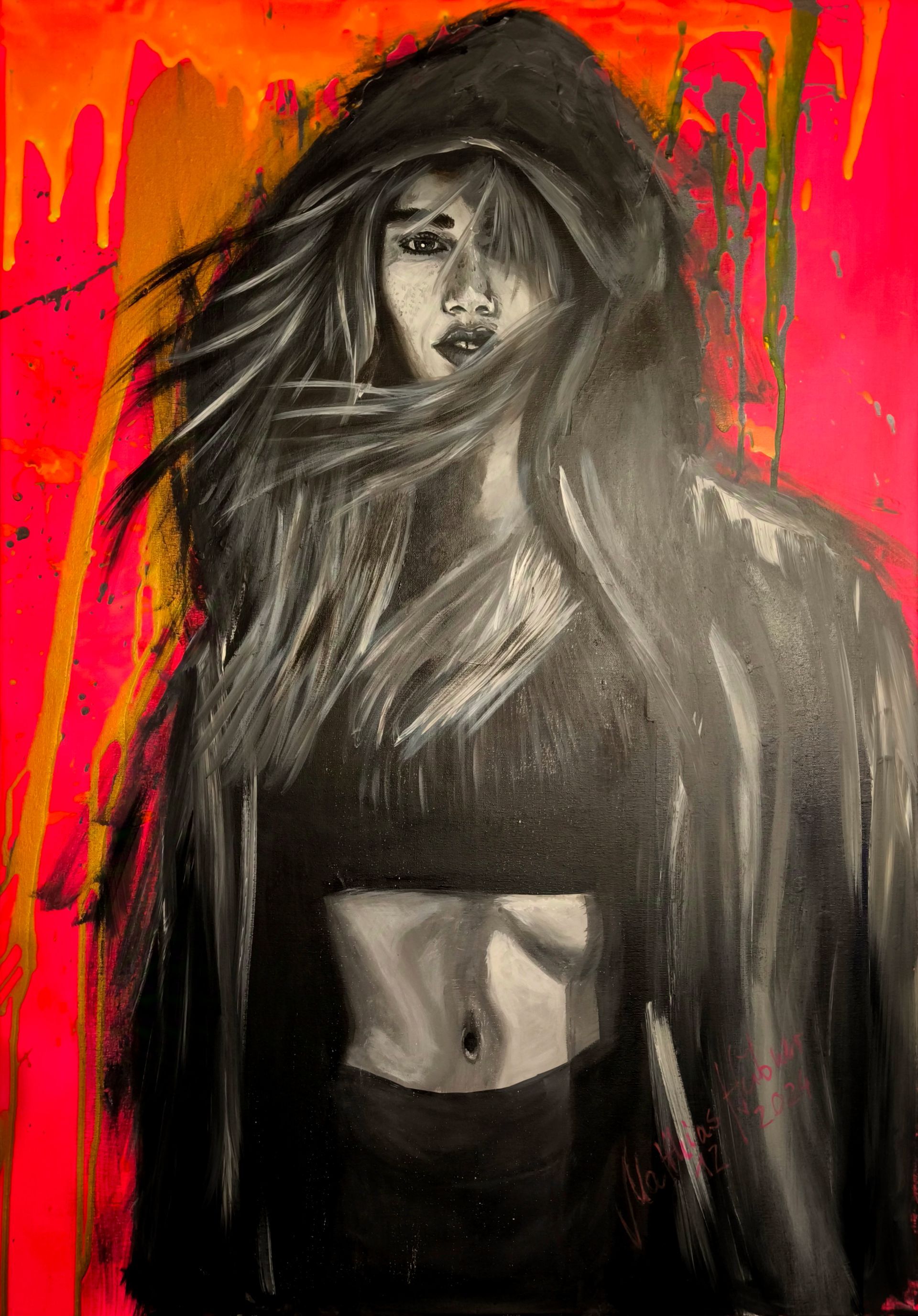 Interessant ist die Entstehung: Zuerst malte ich die Frau vom Gesicht abwärts ohne Mantel und Haare, danach den Hintergrund über das abgeklebte Motiv um dann mit dem Mantel und den Haaren das Hauptmotiv wiederum vor den Hintergrund zu bekommen. ich glaube, dadurch bekam das Bild eine eigene Dynamik.